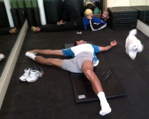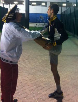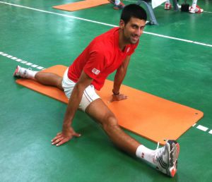 En Londres, Djokovic siempre comienza sus entrenamientos estirando con cintas elásticas. Otros, como Nadal, comparten la costumbre. Lo que les separa es la intensidad, la duración y las variaciones del ejercicio. Si el español suele limitarse a una breve pero frenética repetición de movimientos laterales con los brazos, para activar músculos y articulaciones, el serbio imita también los saques. Luego, deja que Milan Amanovic, su fisioterapeuta, le abrace como un oso para estirarle la espalda, que tire de sus codos y sus hombros, y que le sostenga un pie casi en la cara para trabajar las piernas. Así, explicó en The New York Times Todd Martin, su extécnico, empieza Nole todos sus días. Orgulloso, el serbio se ha fotografiado abierto de piernas como un gimnasta. Es un hombre de goma a la caza de Wimbledon.