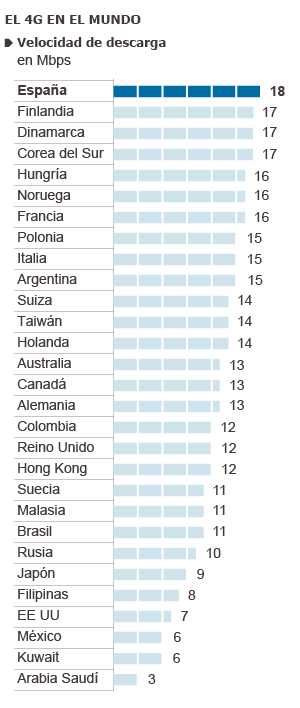 España cuenta con una velocidad media de descarga en sus redes móviles 4G (también conocidas por el estándar LTE o Long Term Evolution) de 18 megabits por segundo (Mbps). Encabeza la clasificación mundial por delante de los países como Finlandia o Dinamarca, y de los asiáticos más tecnológicos, como Corea del Sur, que tradicionalmente dispone de las mejores redes de telecomunicaciones. Además, la velocidad duplica a la de países mucho más desarrollados como Japón (9 Mbps) o EE UU (7 Mbps). La clasificación la cierran Kuwait (6 Mbps) y Arabia Saudí (3 Mbps)