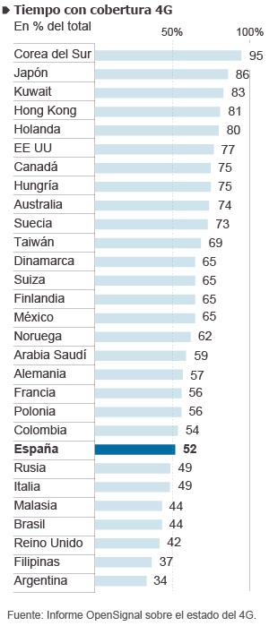 No obstante, España se sitúa en el furgón de cola de los países por cobertura de 4G, medida por el tiempo que los usuarios pasan conectados a esta red respecto al tiempo de conexión total. A los usuarios españoles apenas se les enciende en sus terminales el letrero del 4G la mitad del tiempo que pasan conectados (52%), muy lejos de Corea del Sur, cuyos usuarios pueden disfrutar del 4G prácticamente en todo momento (95%). Japón (86%), Kuwait (83%) y Hong Kong (81%) siguen a los coreanos en la cima de la clasificación que cierran Reino Unido (42%), Filipinas (37%) y Argentina (34%).