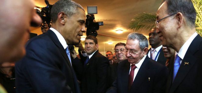 El histórico momento entre Obama y Castro sucedió ante el secretario general de la ONU, Ban Ki-moon, cuando los dos presidentes “coincidieron” antes de entrar en el teatro Anayansi de la capital panameña, donde se desarrolló la ceremonia de apertura de la Cumbre de las Américas.