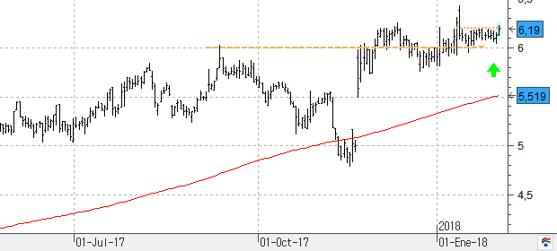 NH Hoteles se encuentra perforando la resistencia de los 6,21 euros tras varias semanas de movimiento lateral. El valor podría estar dando los primeros síntomas de fortaleza. La resistencia clave se encuentra en los 6,43 euros. Estaremos muy pendientes de la superación de este nivel de oferta ya que nos haría pensar en una extensión de las ganancias hasta el nivel de los 7 euros.