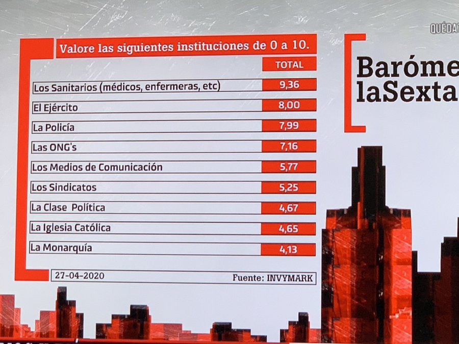 En el barómetro publicado por Invymark para La Sexta, los sanitarios son los mejor valorados por los españoles con un 9,36 sobre diez, seguidos del Ejército, con un 8, la Policía con un 7,99 y las ONG con una nota de 7,16.