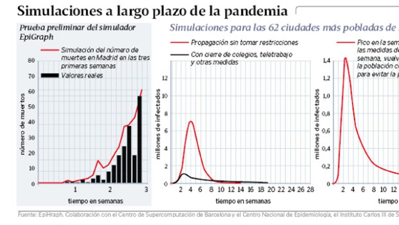En todo caso, los positivos son los que se han podido constantar con las pruebas realizadas en los servicios sanitarios y, también a nivel nacional, se especula que pudieran ser muchas más. ¿Cuántos son y hasta cuántos se podrían aumentar si se levantaran las medidas de confinamiento? A estas preguntas trata de responder EpiGraph, un simulador que utiliza los datos de las 62 principales ciudades españolas para predecir como se puede comportar la epidemia en función de las medidas que se adopten o no para contenerla.